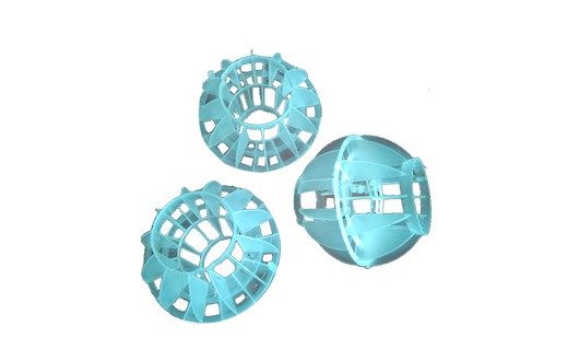 聚丙烯空心球氣速高,葉片多,阻力小;比表面積大,可充分解決氣液交換;具有阻力小操作彈性大等特點。廣泛應用于除氯氣、 除氧氣、除二氧化碳氣等環保設備中。采用聚丙烯塑料制成球狀,在球中部沿整個周長有一道加固環,環的上下各有十二片球瓣, 沿中 心軸呈放射形布置,適用于二氯化碳脫氣塔,接觸反應塔等裝置。