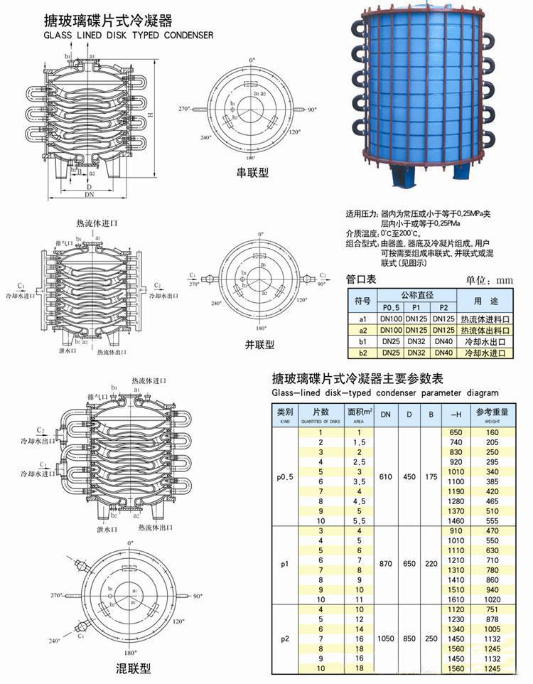 1、搪玻璃碟片式冷凝器分P1型及PO. 5型兩種型號。伶凝面積P0.5型,每片為0.5平方米,設備外徑為700mmo P1型,每片冷凝為1平方米,設備處徑為960mm。定型規格為1. 5-15平方米系列,可根據所需冷凝量來選擇。